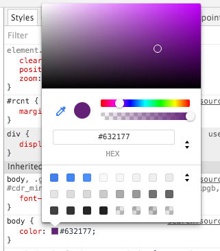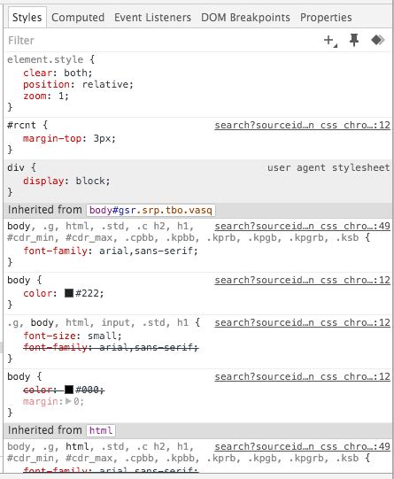 The window that opened up should have a subwindow on the right looking like the above image. There you see we're in the 'Styles' tab. The content within are actual styles, and most of them should be coming from a stylesheet file, otherwise from the browser's default stylesheet. Each style rule starts with a few words called a selector, followed by an opening curly brace {, with styles inside, ending with a closing brace }. Example: